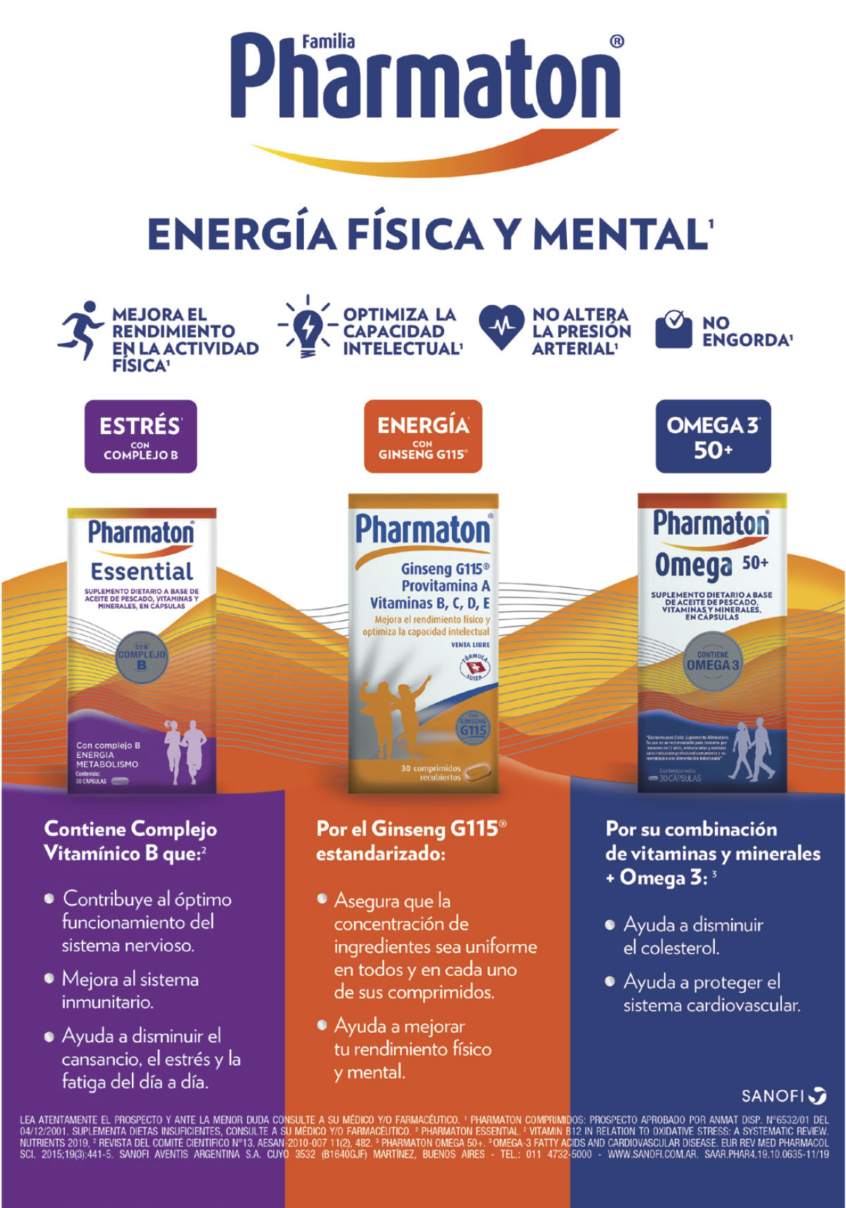501 pacientes de 18-65 años de edad durante 3 meses. DrugsExp Clin Res 1996; 22 (6): 323 – 329. 9.Kuhlmann PW, Impaired Memory Retrieval and Psychosocial Stress in Healthy Young Men. The Journal of Neuroscience. 2005; 25(11): 2977–2982. 10.Âkerstedt T. Psychosocial stress and impaired sleep. Scandinavian Journal of Work, Environment & Health. 2006;32(6)439-501. 2006; 32(6): 439-501. 11.Yaribeygi PS. The impact of stress on body function: A review. EXCLI Journal. 2017; 16: 1057-1072. 12.Kennedy O. B Vitamins and the Brain: Mechanisms, Dose and Efficacy—A Review. Nutrients. 2016 Jan 27;8(2):68. 13.Cuciureanu MD, Vink R. Chapter 19: Magnesium and Stress In: Vink R, ed. Magnesium in the Central Nervous System. University of Adelaide Press; 2015. 14.Whyte KF, Addis GJ, Whitesmith R, Reid JL. Adrenergic control of plasma magnesium in man. Clinical Science. 1987;72: 135–138. 15.Murck H. Magnesium and affective disorders. NutrNeurosci. 2002;5: 375–389. 16.Erik E. van de Lagemaat, Lisette C.P.G.M. de Groot, et al. Vitamin B12 in Relation to Oxidative Stress: A Systematic Review17.National Center for Environmental Health. Second National Report on Biochemical Indicators of Diet and Nutrition in the U.S. Population. 2012. 18.Jain A, Aggarwal K, Zhang P. Omega-3 fatty acids and cardiovascular disease. EuropeanReviewfor Medical and Pharmacological Sciences. 2015; 19: 441-445; 19. PHARMATON COMPRIMIDOS: PROSPECTO APROBADO POR ANMAT DISP. N°6532/01 DEL 04/12/2001. SUPLEMENTA DIETAS INSUFICIENTES, CONSULTE A SU MÉDICO Y/O FARMACÉUTICO. 20 PHARMATON ESSENTIAL. VITAMIN B12 IN RELATION TO OXIDATIVE STRESS: A SYSTEMATIC REVIEW.