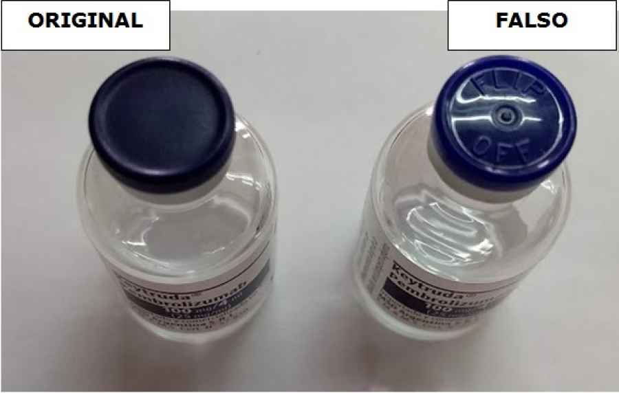 Las unidades falsificadas poseen los precintos de seguridad de los estuches secundarios (cajas) violados; con cinta adhesiva transparente sobre estos o pegados con pegamento y no poseen etiquetas de trazabilidad. La tapa plástica del vial (envase primario) tiene la inscripción “Flip off” en relieve, mientras que la unidad original no tiene incripciones.